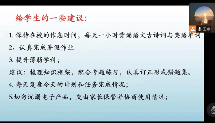 其次班主任给家长们提出了暑假期间学生居家学习的安排建议,要求同学们要制定好假期学习计划,要抓住时机进一步夯实基础同时补足薄弱学科的短板,为即将到来的高三冲刺做好准备班主任同时希望所有家长都要树立高三意识,积极营造良好和谐的家庭环境,劳逸结合,帮助学生高效合理地安排假期的生活和学习班主任指出,虽在假期但家校沟通不能中断,老师将通过不同途径开展家访等家校共育活动,共同呵护孩子们的假期成长。