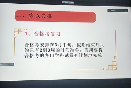 各班班主任从学生的假期生活、作业安排、安全问题、正确看待成绩、做好家校沟通、培养学生的良好品德、做好学生个人成长规划等方面与家长进行了沟通和交流。首先向家长们总结汇报了本学期教学开展的情况,重点分析了班级学生学习情况,既肯定了优点,又指出了存在的问题,同时还作了更为详细说明。希望家长们在寒假继续配合老师,做好孩子们的学习管理工作,做好孩子们的学习陪伴者。帮助孩子们制定学习、生活、锻炼计划,养成良好的作息习惯。做好孩子们的学习引导者,培养孩子们的自主学习能力。希望通过家校联动,齐抓共管促进孩子们假期保持积极健康的学习和生活状态,迎接新学期的到来。