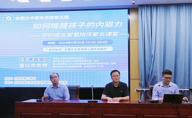 为贯彻落实《关于开展合肥市第七届中小学心理健康暨第三届家校共育宣传月活动的通知》文件精神,进一步提升家长的科学养育观念,充分发挥家长在家庭、学校、社会一体化教育中的作用,2024年5月30日下午,我校隆重举办了2024年春季学期家长学校第三期专题讲座。