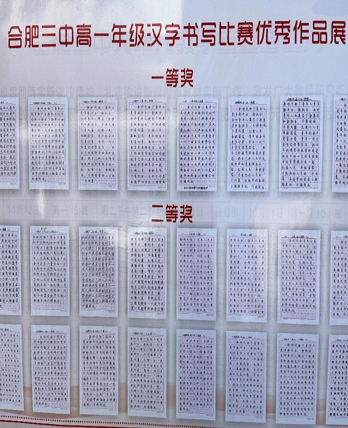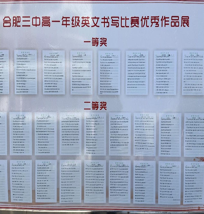 本次活动,高一年级全体同学积极参与,最终评选出一、二、三等奖。作品有的端正秀气、运笔熟练、提按分明;有的舒展大方、运笔流畅、行款整齐,充分展示了学生们对汉字和英文的掌握程度,更让大家感受到了不同语言文字后不同民族文化的无穷魅力。