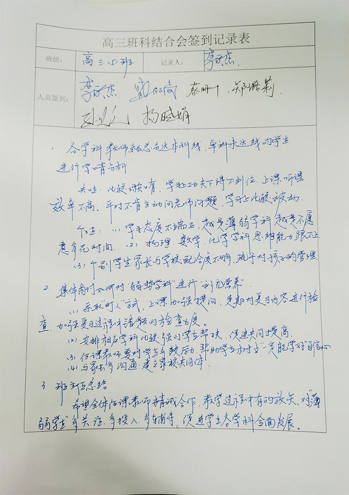 研讨过程中,各班级班主任均具体分析了本班级现状,接着就班级呈现出的课堂课下问题与其他科任老师进行交流,并且提出后期复习中需要实行的措施及想法。接着,各科老师就教学方面也是各抒己见,献言献策。