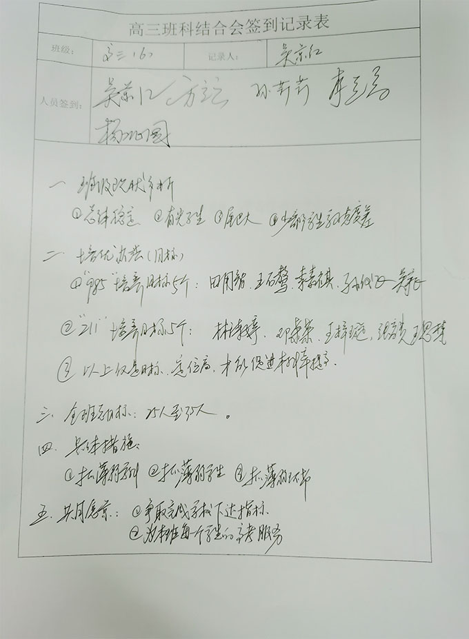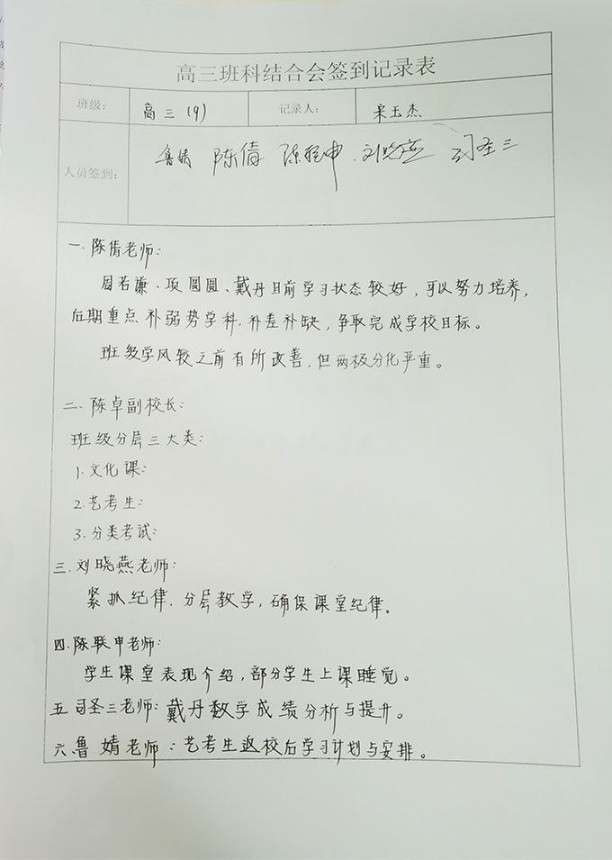 班级学情分析会由各班班主任主持,班级各科授课老师全员参加。级部要求班主任就班级管理存在的问题,改进的工作措施,班级目标的制定、临界生的辅导等做中心发言;科任老师积极参与,认真商讨切实可行的实施方案。
