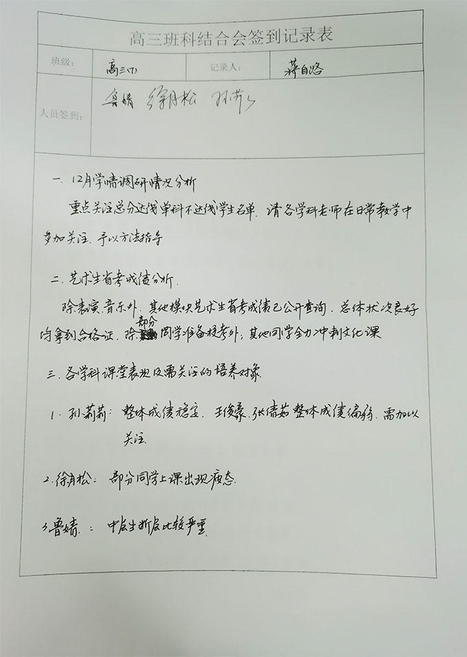 为进一步加强班级管理建设,细化学生辅导工作,促进教师之间的交流,12月的最后一周,高三年级各班按照年级部的统一安排,在10月份班科结合会的基础上,再次召开了班级学情分析会。