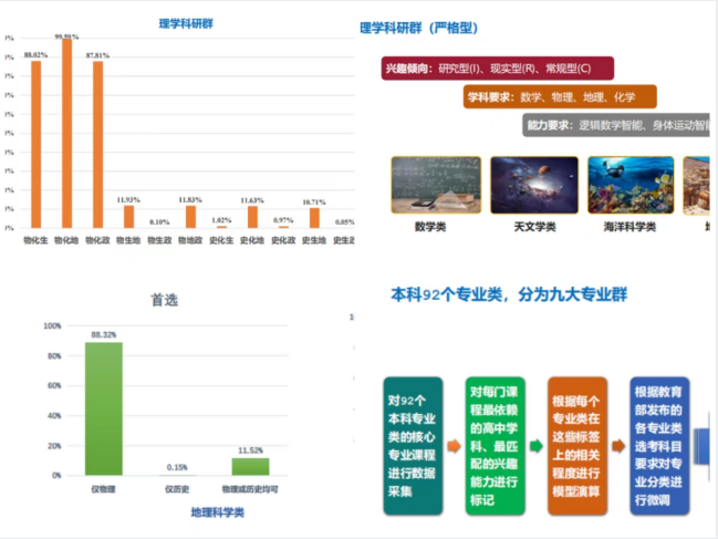 接下来,为了帮助同学们快速地掌握大学专业的类型,吴锐老师对2024年拟在皖招生的37680个本科专业进行了详细的分析。对本科92个专业类的核心专业课程进行数据挖掘后,吴老师将这些专业课程大致分为理学科研群、基础工程群、生物医学群、人文历史群等九大专业群,并介绍了九大专业群的兴趣倾向、学科要求、能力要求等,针对不同选科组合分别能够报考哪些大学专业群也作了详细介绍。