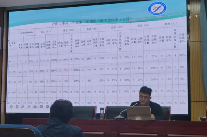 会议第一阶段由滕主任对高二年级下学期开学以来所做的工作进行总结发言。滕主任指出,在疫情形势不断变化的特殊背景下,校内教学工作的开展也面临着许多新的挑战和问题。高二年级部全体教师迎难而上、勠力同心,坚持贯彻家校共育理念,在积极完成防疫工作的基础上竭尽所能保证小区封控学生、居家观察学生、在外训练学生等特殊情况学生都能和在校学生一样正常完成学业,取得了丰硕的成果。具体表现在期中六校联考成绩上,各学科都取得了一定进步。滕主任细致分析了期中考试成绩所反映出的突出亮点和存在的不足,教学工作中要关注学生们普遍容易失分的知识点,对存在弱势学科的学生要积极帮助其寻找问题,克服困难。