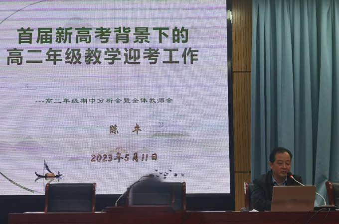 会议第二项,副校长陈卓以“首届新高考背景下的高二年级教学迎考工作”为主题发表讲话。陈校长首先对本次期中考试成绩中存在的问题进行了深刻总结,并对后期工作提出建议。他指出后期要进一步做好学情分析工作、加强新教材新课标研究工作、协调教学计划和实际进度、落实各个层面的管理工作。最后,他分享了对新高三复习的初步思考,强调教师们要确定课时复习目标的制定流程和叙写要求,认真研究真题、明确方法,做到教学评一体化,争取提高复习效益。
