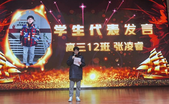 接着,高三12班学生代表张凌睿同学发言。他希望同学们能珍惜时间,以积极、自信的心态备考,充分发挥优势。他号召同学们唤醒潜能,凝聚力量,争取每一分成绩,追求每一分进步。惟有破釜沉舟背水一战,才能让青春不留遗憾。他代表全体高三学生表达了迎战高考的决心和信心,同学们会以饱满的精神、昂扬的斗志,为梦想冲刺。
