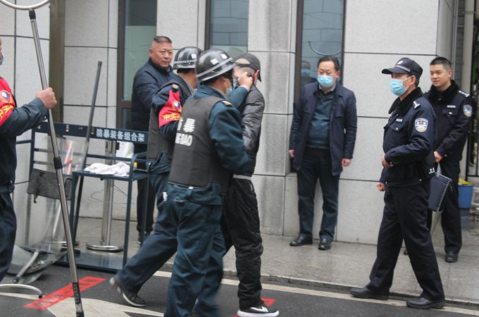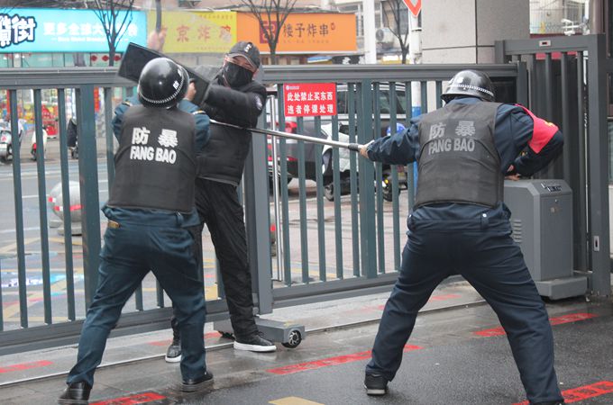 由我校工作人员饰演的“歹徒”突然出现在校门外,拿着利器冲向学校,企图闯进校园,张黎明和聂坤带领保安队员手持安保器械立即上前,与歹徒周旋阻止其进入学校,并拨打110报警电话。在等待警察支援的同时积极开展围捕,将歹徒成功制服,整个演练活动圆满完成。