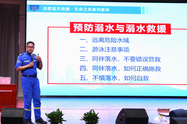 保卫科科长聂坤简要介绍了本次讲座的主讲团队——合肥市蓝天救援队的志愿者们。作为一支民间专业、公益性紧急救援机构,蓝天救援队长期致力于水域救援、灾害抢险等公益行动,凭借丰富的实战经验和专业的救援知识,多次在突发事件中挽救生命、传递温暖。