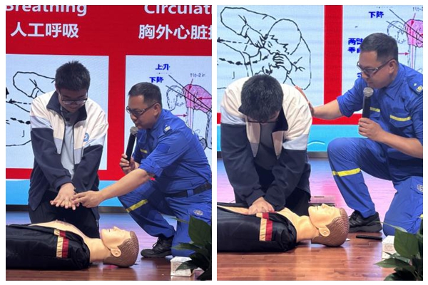 为强化急救技能实操性,讲座特别设置急救技能培训环节。蓝天救援队队员现场演示AED(自动体外除颤器)的使用方法,并分步骤讲解心肺复苏的操作要点,包括判断意识、胸外按压、人工呼吸等关键流程。在志愿者指导下,多名学生主动上台参与模拟演练,通过“手把手”教学掌握急救要领。活动现场互动频繁,学生们认真记录操作细节,踊跃提问,在沉浸式体验中深化了对“黄金救援4分钟”重要性的理解。