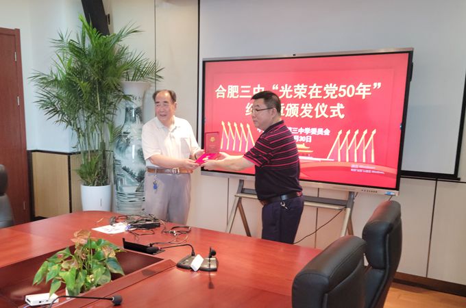 冬云代表学校党委为在党50年老党员杨继琨老师颁发“光荣在党50年”纪念章并送上慰问金,对杨老师获得奖章表示热烈祝贺和崇高敬意。