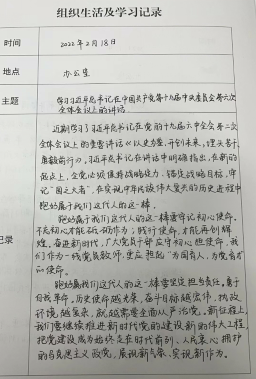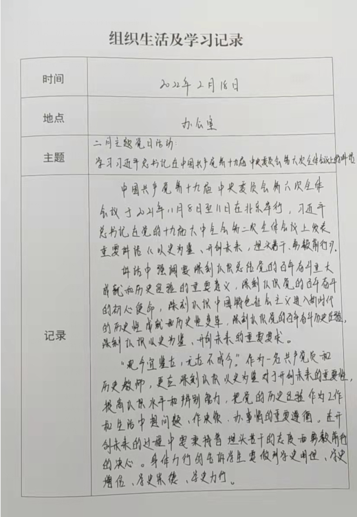 党员同志通过自主学习,分享学习心得,以学促思,以思践行。徐文墙表示:要立足合肥教育改革的现在和未来,立足学校校情和学情,发挥党组织的战斗堡垒和党员的先锋模范作用,将三中建设得更加美好。王婷表示:对党忠诚是每个党员必备的政治品格,真正做到忠诚党和人民,不喊口号,认真工作,履职尽责,在日常工作中要做到思想自觉、政治自觉、行动自觉。李梦表示:作为一名历史老师,深知以史为鉴对于开创未来的重要性,身体力行的告诉学生要做到学史明理、学史增信、学史崇德、学史力行。韩娟表示:在学习中课堂上,和同学们共同深入学习党的历史,坚定历史自信,点亮精神灯塔,牢记奋斗目标,豪情满怀奋进新征程。