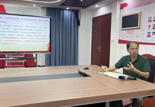 活动伊始,学校党委书记马剑为支部党员上了一堂生动且深刻的党课,对党的二十届三中全会精神进行了系统的梳理和深入的解读。马剑强调,党的二十届三中全会是在中国共产党带领人民以中国式现代化全面推进强国建设、民族复兴伟业的关键时期召开的一次极为重要的会议。全会审议通过的《中共中央关于进一步全面深化改革、推进中国式现代化的决定》,紧紧围绕推进中国式现代化这一中心任务,对进一步全面深化改革作出系统部署,是站在新的历史起点上推动全面深化改革向广度和深度进军的总动员,是指引新征程改革开放的重要纲领性文件。马剑号召党员同志们要坚定不移地拥护党中央的领导,为全面建成社会主义现代化强国、实现第二个百年奋斗目标,以中国式现代化全面推进中华民族伟大复兴而努力奋斗。