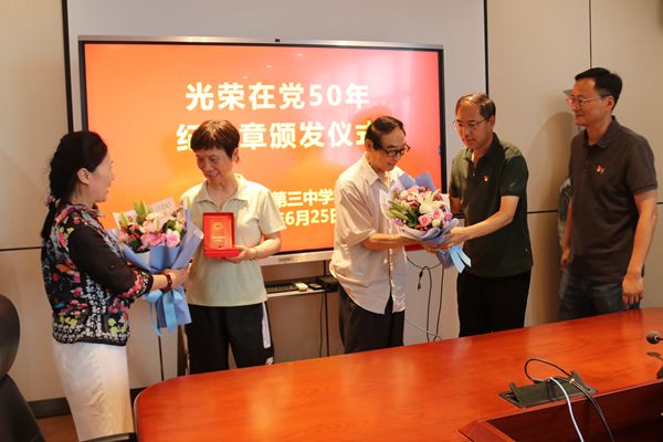 随后,校领导为两位老同志颁发纪念章和鲜花,以表达对他们的崇高敬意。马剑强调,老党员用半个世纪的坚守,深刻诠释了“为党育人、为国育才”的教育初心,他们的精神是学校最为宝贵的财富。