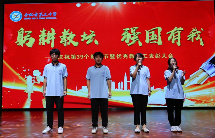 大会开始前,校园十佳歌手代表带来暖场歌曲《我曾遇到一束光》,他们用声情并茂的演唱,表达了三中学子对老师的诚挚祝福。