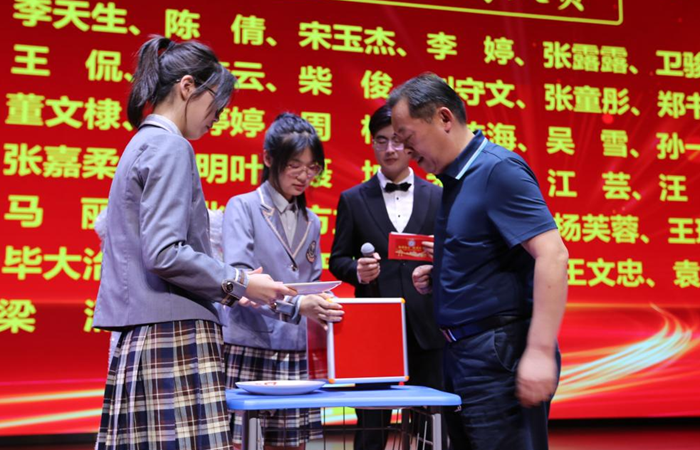 校领导为所有受表彰的教职工颁发荣誉证书,学生代表也献上了一束束充满祝福的鲜花。