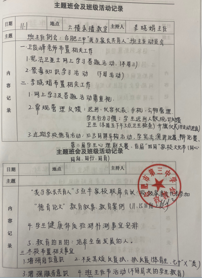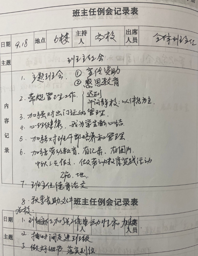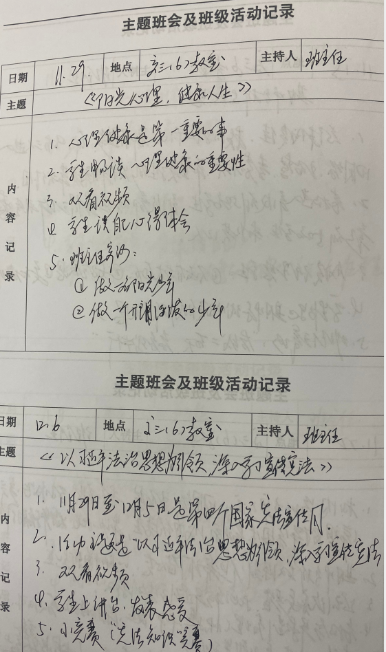 翻开每位班主任的工作手册,对学生、班级基本情况记录的详实细致、家校共育工作的高度重视、主题班会课的精心设计、活动内容的丰富多样,7+X学生的关心爱护……一笔一划记录着班主任们用心工作的历程,点点滴滴凝聚着班主任们的智慧和汗水。