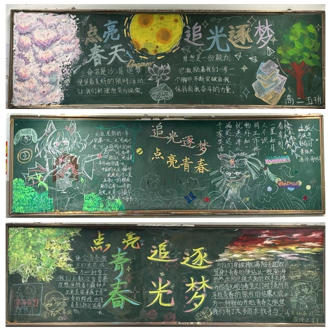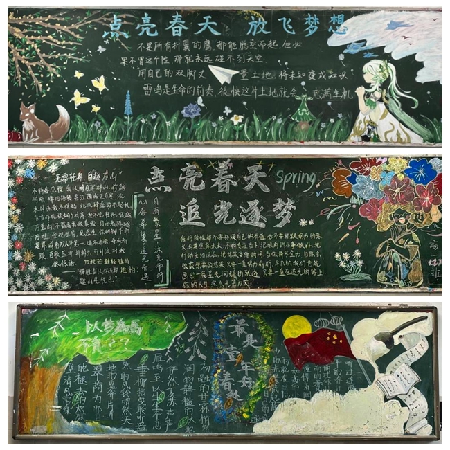 各年级老师和同学们根据主题进行了精心的准备。同学们通过绘画、书写的方式,精心选材、明确分工,充分发挥自己的聪明才智。他们创新思维,通过巧妙的设计,精心的布局,用手中最简单的粉笔,将各类精致元素恰如其分地融合汇聚,在黑板上创作了一幅幅妙手丹青的作品,让“方寸之地”更具“无限风景”。