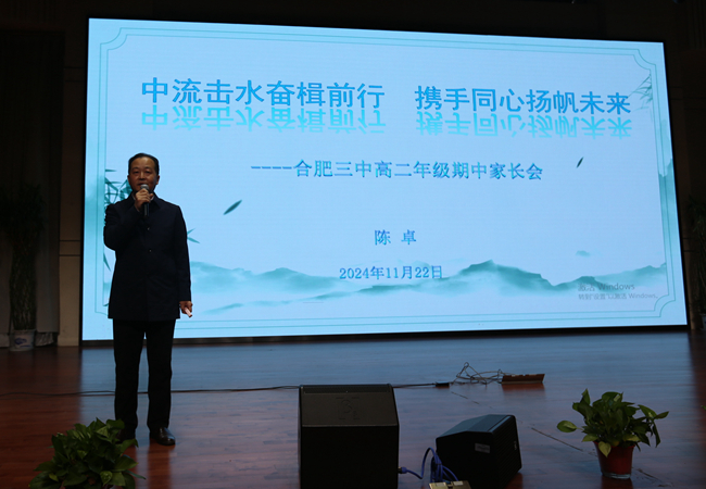 会议第一项:点点手机版下载官网app教学副校长陈卓面向高二全体家长,进行了主题为“中流击水奋楫前行  携手同心扬帆未来”的讲话。陈校长首先呈现了学校近三年高考达线情况,让家长们精准定位,坚定信心。接着介绍了新高考背景下学校教学工作的总体规划,让家长对学校的教育教学管理工作有了更加全面、细致的了解。最后,陈校长真诚地告诉家长们,陪伴在先,教育在后,随时鼓励,定期反思。