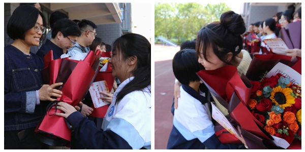 仪式进入温馨环节,各班学生代表为班主任们献上鲜花与手绘贺卡。一声声“老师您辛苦了”,一个个鞠躬与拥抱,表达出三中学子最真诚的敬意。美丽的鲜花和温暖的笑容互相映衬,师生间的情感在这一刻自然流淌,欢呼声与掌声交织成校园里最动人的乐章。