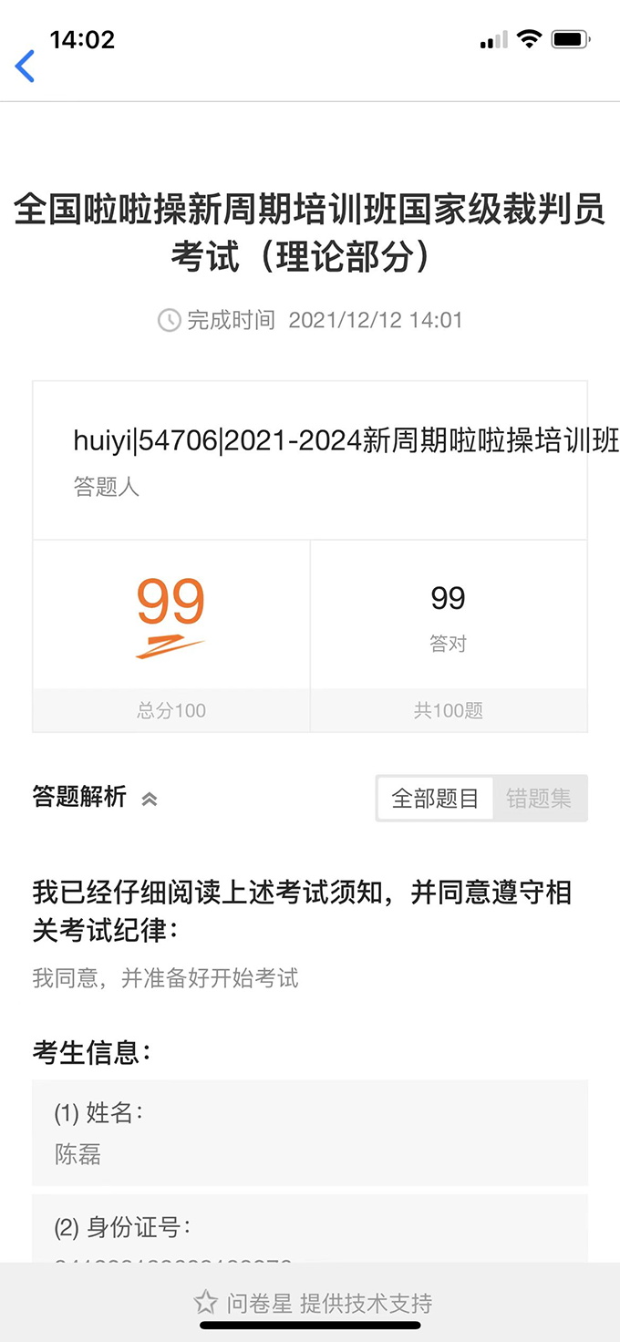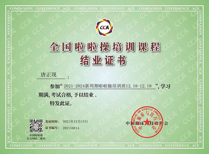 2021年12月,我校教师陈磊、唐正现参加了由国家体育总局体操运动管理中心、中国蹦床与技巧协会举办的“2021-2024新周期啦啦操培训班12.11-12.12”、“2021-2024新周期啦啦操培训班12.18-12.19”,经过严格的培训与考试,分别获得“啦啦操国家级裁判员”(考核已通过,拟批复)、“啦啦操国家一级裁判员”证书。