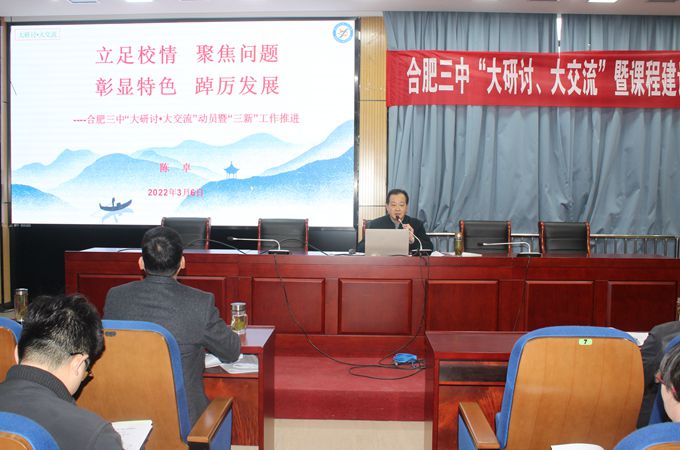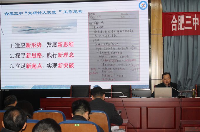 上午的会议首先由陈卓副校长作“大研讨、大交流”动员并部署“三新”推进工作。陈校长以“立足校情,聚焦问题,彰显特色,踔厉发展”为主题,对上学期的教学成绩做了回顾,并对本学期的工作重点做了强调。在回顾教学成绩时,陈校长根据近三年各年级在合肥市六校联考及高三年级在全市模考中的相关数据,并结合合肥市教育布局的调整,分析目前学校的教学形势,号召教师们走出舒适圈,在“大研讨大交流”中“适应新形势,发展新思维;探寻新思路,践行新理念;立足新起点,实现新突破”。在部署工作重点时,陈校长结合前期召开的教研组长工作会议、各年级教学工作会议及“三新”推进工作的最新要求,强调本学期的工作重点为进一步完善学校新课程体系、开发特色校本课程、落实“大研讨大交流”、完成“三新”考核重点工作。陈校长还具体列出了教研组、职能处室需要研讨交流的问题提纲,各自的分工和需要完成的任务。