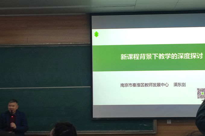 此次教研会邀请了江苏省特级教师渠东剑老师。渠老师作为主讲人,对新课程背景下的数学教学进行了深刻的探讨,主要从三个方面展开:第一个方面,核心素养的个人理解(永远的教育育人、数学育人以及教数学育人);第二个方面,从数学再创造的过程、数学活动的教学过程和数学活动是师生双边活动过程来理解数学教学的本质;第三个方面,怎样教学生学会思考。这也是大多数年轻教师容易忽略的地方。教学需要让学生在思考的过程中学会思考,完成这一点可以从问题结构推进教学、启发性提示语引导学生思考等方面着手。