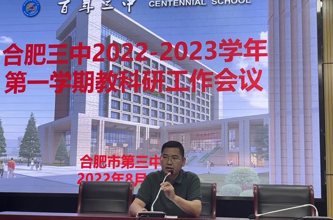 会议首先由教科室副主任袁艳总结上一学年开展的“大练兵·大比武”、“大研讨·大交流”活动并布置本学期的教科研工作。袁副主任就上一学期“三新”工作的开展做了总结,汇报了“大练兵·大比武”、“大研讨·大交流”活动的获奖情况,对各教研组、备课组在上一学年中的教科研工作表示肯定。袁副主任强调,各教研组、备课组要及时提交学期工作计划,充分利用合肥市教育云平台开展集体教研。同时,袁副主任对近期的大单元教学优质课展示活动、合肥市中小学教育教学论文评选活动、第四届教坛新星遴选工作、“青蓝工程”等相关工作进行部署,宣读关于进一步规范管理全市中小学生参加竞赛活动的通知。