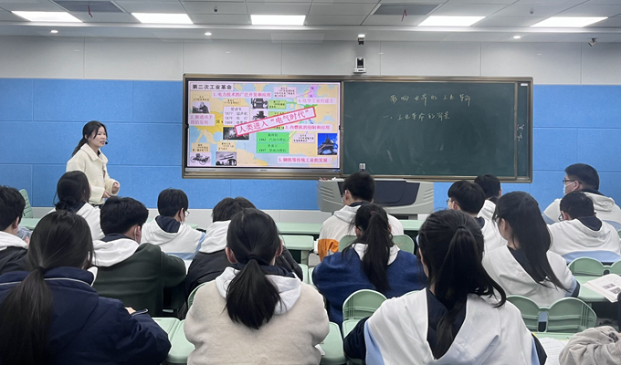 第一阶段是高一年级大单元教学校内公开课。4月7日上午第一节课,郝绵永老师在君尧楼录播教室展示中外历史纲要下册第10课《影响世界的工业革命》。郝绵永老师首先以《曼彻斯特:工业革命的故乡》中的一则材料导入,以城市发展为切入点讲授新课,通过“棉都兴起”、“蒸汽换新天”、“电力酿新途”、“工业创新局”为主题串联两次工业革命的背景、进程和影响。引导学生分析工业革命从英国兴起的原因,结合材料对比分析两次工业革命的特点,以小组讨论、角色扮演的形式探究工业革命的影响,最后引导学生从城市的兴衰中获得启示。