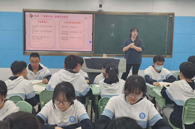 杨芙蓉老师以《看盛衰兴亡 探援史析论》为题,在分析写作背景和梳理文本的基础上,对比两篇文本在谋篇布局上的异同,进而引导学生思考写作风格上的差异。课堂教学思路清晰,环环相扣,注重培养学生的理性思辨能力。