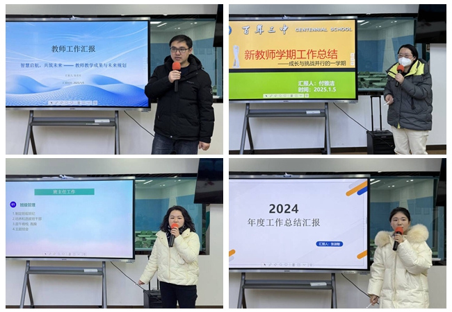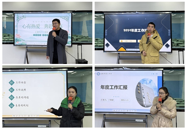 会议第一项,2022年、2023年教师代表以及2024年新入职教师张盖茨、郝绵永、束超、姜薇薇、付培培、姚佩辰、丁晓丽、李淼、陈迪、邓俊、张淑敏、李晓婉、陈勇军、付雅洁依次上台,他们通过精心准备的PPT,图文并茂地展示了各自在教学工作中的点滴积累与显著成果。从工作内容到未来规划,从教学方法探索到班级管理经验分享,青年教师们的汇报内容丰富多样,充分彰显了他们在教育岗位上的用心与成长,为台下的教师们提供了宝贵的借鉴经验。