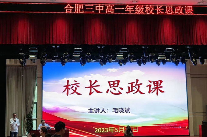 为落实立德树人根本任务,引导广大学子坚定理想信念,厚植爱国主义情怀,树立正确的世界观、人生观、价值观,激励他们肩负时代使命,为实现中华民族伟大复兴的中国梦而努力奋斗。5月24日下午,合肥市第三中学高一年级全体学生在君尧楼会堂开展了以《做“五高”学生,担复兴责任》为主题的思政课教育活动,校长毛晓斌主讲,高一年级部主任蒋自路主持,高一年级全体学生参加了本次活动。