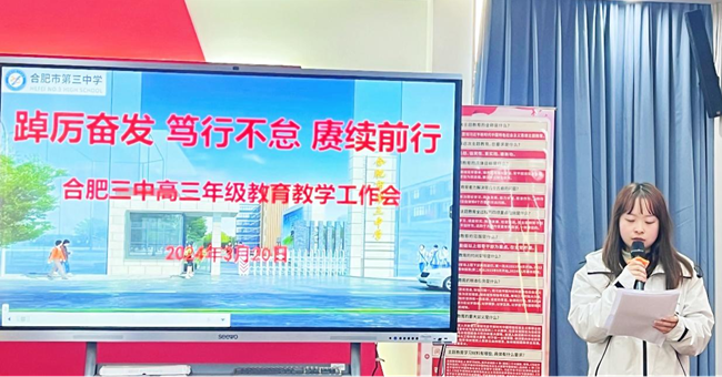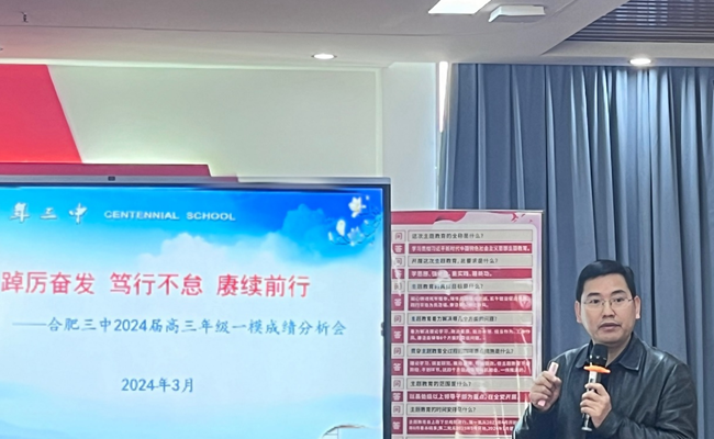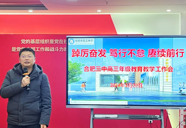 为科学分析学情,明确教学工作方向,有效调整教学策略,2024年3月20日,合肥市第三中学高三年级召开主题为“踔厉奋发,笃行不怠,赓续前行”的教育教学工作会议。会议由高三年级部主任郑书建主持,校党委书记马剑、校长沈龙海、副校长陈卓、副校长杨庆吉、副校长张黎明及学校部分中层干部出席会议,高三年级全体教师参会。