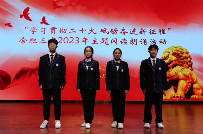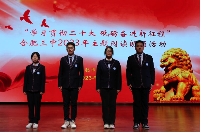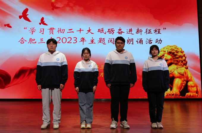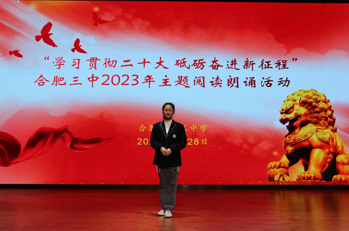 为深入学习贯彻党的二十大精神,推动二十大精神进校园,热情讴歌党的丰功伟绩,凝聚团结奋进的精神力量,进一步加强中学生理想信念教育和爱国主义教育,合肥市第三中学于2023年4月28日开展了“学习贯彻二十大 砥砺奋进新征程”主题阅读朗诵活动。