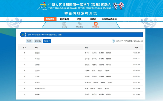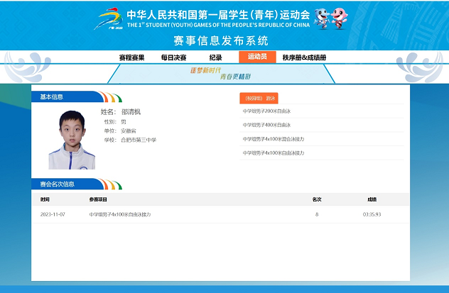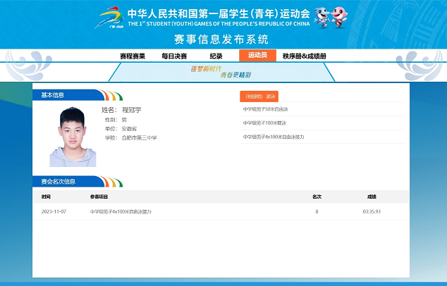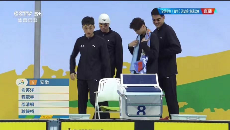 2023年11月7日下午,中华人民共和国教育部、国家体育总局、中国共产主义青年团中央委员会共同主办的第一届全国学生(青年)运动会游泳比赛在广西体育中心游泳跳水馆展开角逐。由合肥市第三中学学生程冠宇、邵清枫,以及蚌埠市第一中学学生俞苏洋,蚌埠铁路中学学生耿毅桥组成的参赛队,代表安徽省参加中学组男子4 X 100米自由泳比赛取得第八名。