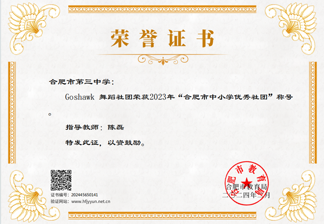 近日,合肥市教育局公布2023年合肥市第十二届中小学社团评选结果,合肥市第三中学Goshawk舞蹈社团荣获2023年“合肥市中小学优秀社团”称号。