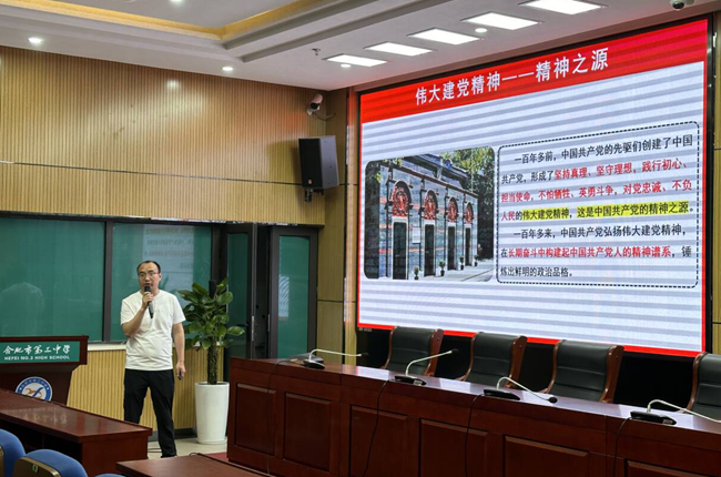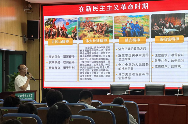 为深入学习贯彻习近平新时代中国特色社会主义思想,引导广大青年学生坚定中国特色社会主义理想信念,树立更高的人生目标,扣好人生第一粒扣子,积极培育和践行社会主义核心价值观,2024年5月20日,合肥市第三中学在君尧楼二楼举行入团积极分子团课第五讲—《中国精神的时代传承》,本次团课由政教处束传海老师主讲,校团委副书记陈磊、张盖茨老师及全体入团积极分子参加。
