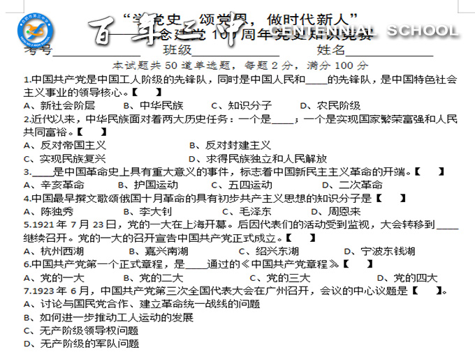 今年是我们伟大的中国共产党建党100周年。为进一步落实习近平总书记在全国教育大会重要讲话精神,培育新时代全面发展的高中生,为进一步激励学生在学习党史中悟原理、明使命,厚植爱党爱国情怀,4月7日下午,三中历史《高中历史研究性学习校本实践研究》课题组在学校政教处、高一年级部、第一党支部大力支持下,举办了“学党史、颂党恩、做时代新人”纪念建党100周年知识竞赛活动。