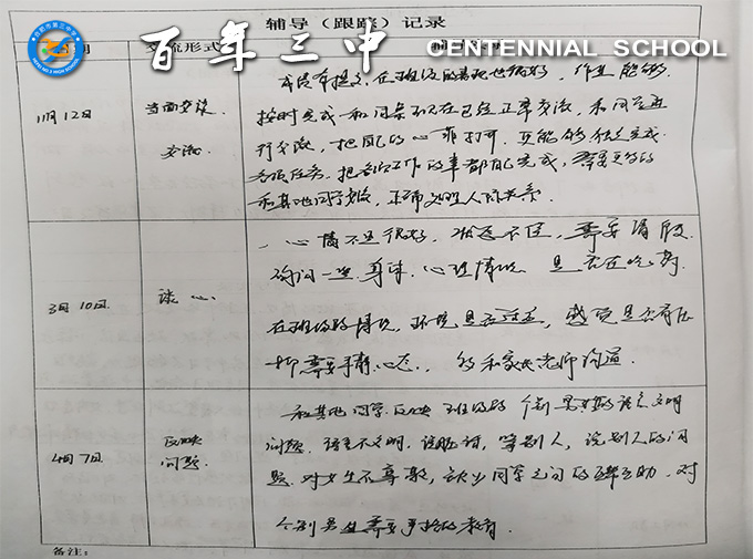 每学期开学初,在校学生成长指导中心的组织下,各班级对家庭不完整、家庭不和谐、过度内向等七类特殊学生群体进行新一轮摸排,实现学生信息动态更新,并建立特殊学生台账。班主任根据特殊学生摸排情况,按照一生一案,采用面谈、电话沟通等方式进行辅导、关爱,并认真做好记录。