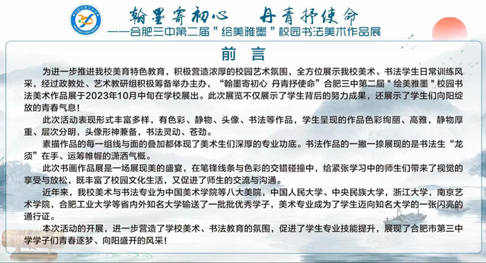 书画吐秀竞风雅,翰墨飘香存菁华。此次书画展充分展示了三中学子良好的艺术素养和积极向上的精神风貌,培养了学生认识美、发现美、创造美的能力,推进了学校校园文化建设。