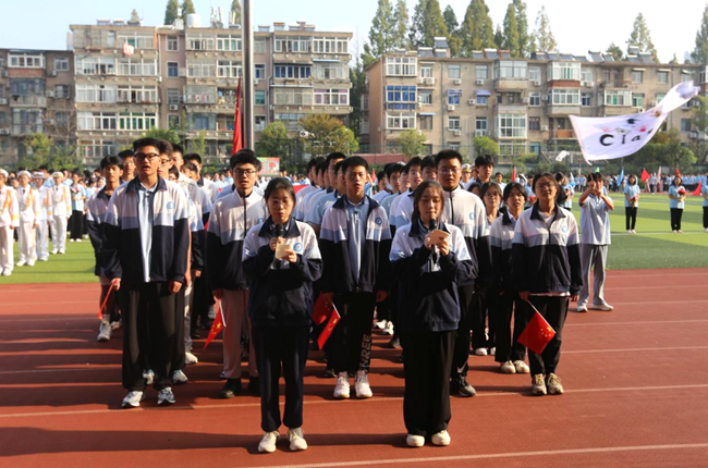 上午7点30分,运动会入场仪式在欢声笑语中正式拉开序幕。国旗队、鲜花队和彩旗队依次入场,步履整齐,气势轩昂。同学们用铿锵有力的步伐和热情洋溢的笑容,展现了新时代青少年的朝气与风貌。旗林猎猎,心跳怦怦,与方阵共鸣,激情澎湃,扬青春梦想。