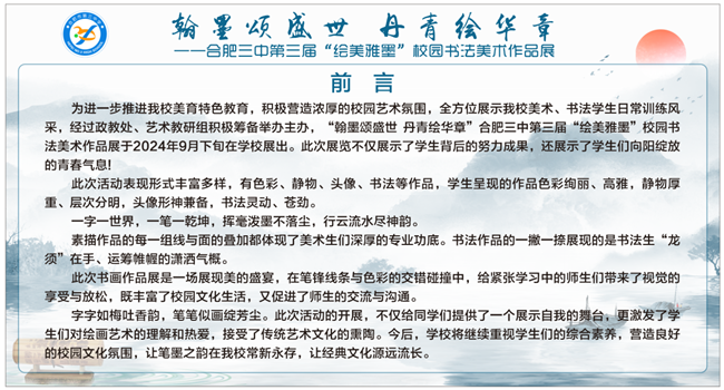 为庆祝中华人民共和国成立75周年,落实立德树人根本任务,厚植学生爱国情怀,营造浓厚的校园艺术氛围,点点手机版下载官网app政教处协同艺术组举办了以“翰墨颂盛世 丹青绘华章”为主题的第三届“绘美雅墨”书画展。