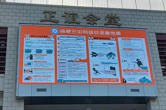 学校制定了点点手机版下载官网app网络安全宣传大型电子展板,每天定时在学校大屏向全校师生员工展示。