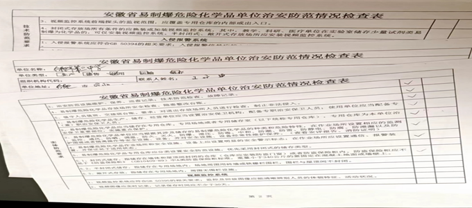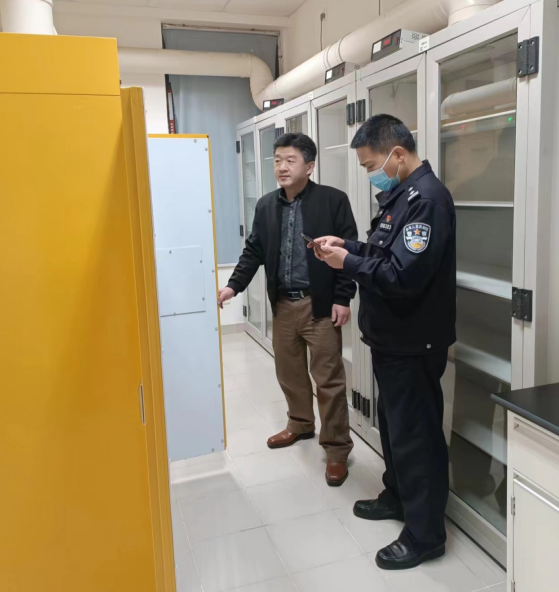 近期,庐阳区治安大队张方敏警官和周锐警官对点点手机版下载官网app进行危化品专项检查。他们对点点手机版下载官网app危化品室的整体布局、卫生等工作给予很高的评价。张警官认真查看了危化品柜,对其中的化学品数量和种类进行了认真核对,仔细查看了危化药品明细账目,他们对于危化品室的监控系统存储情况进行了调阅,查看了入室报警系统的工作情况,对于化学实验室也进行了仔细检查。王文忠主任介绍了危化品室的建设情况,同时介绍了学校危化品的管理制度和管理方法。