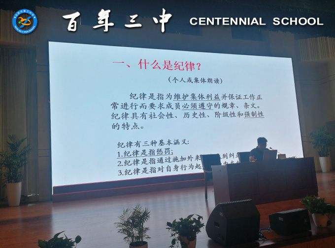 接下来滕主任从“什么是纪律”、“为什么要遵守纪律”、“违反了纪律怎么办”和“遵守纪律对我们有什么意义”四个方面透彻阐述纪律及遵守纪律的重要性和必要性,强调树立良好校风、打造健康校园环境离不开每一位学生的自我约束和长期坚持。他认为,千里之行,始于足下,遵守校规校纪应当从不迟到、不早退、不携带电子产品、上课不睡觉、作业按时完成等小事做起。不守规矩将受到相应的严厉惩罚,而现在就养成遵守规则的习惯,将来就会成为一个有担当、有责任感的优秀公民。