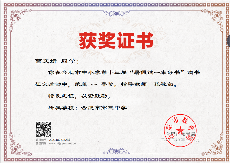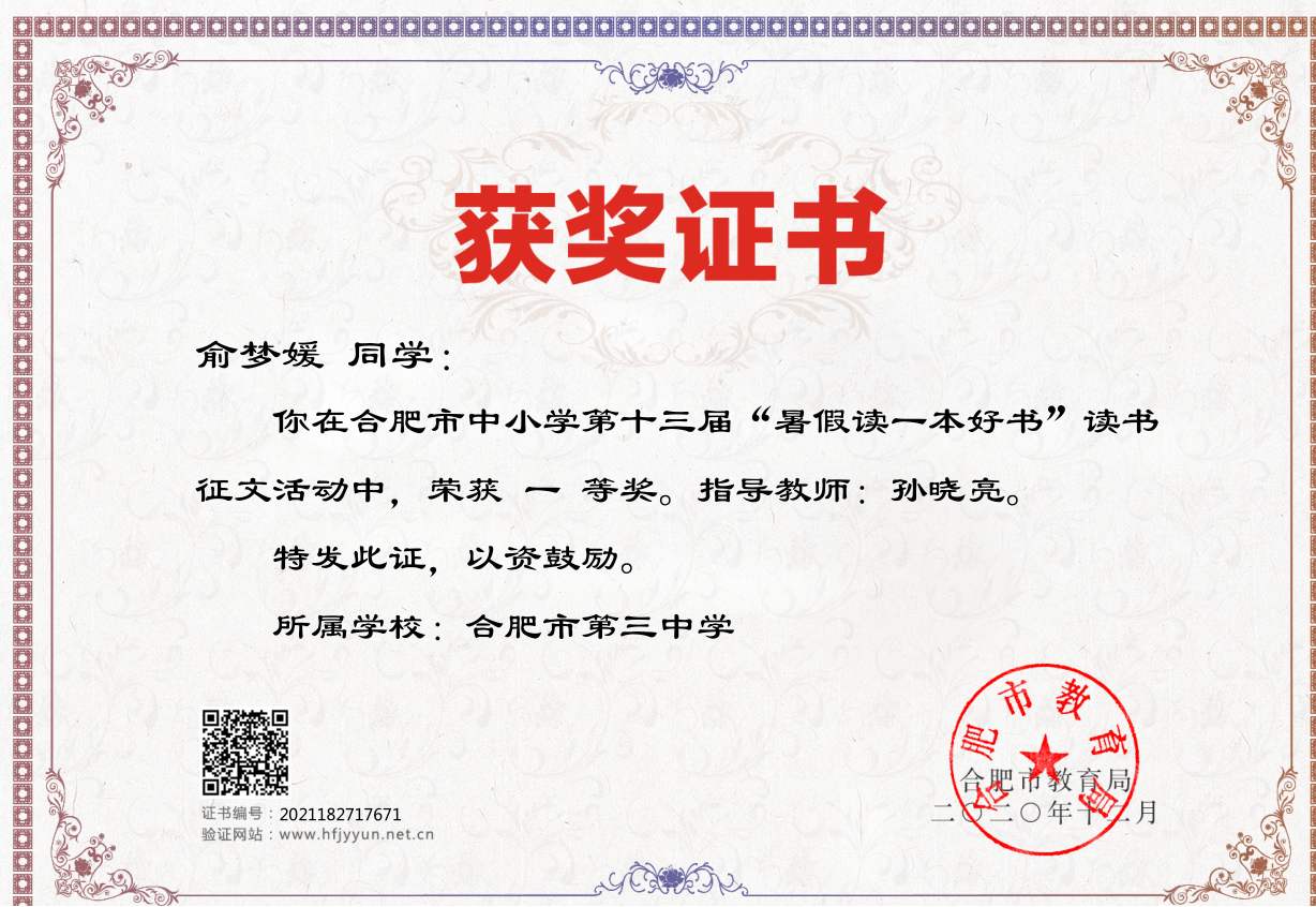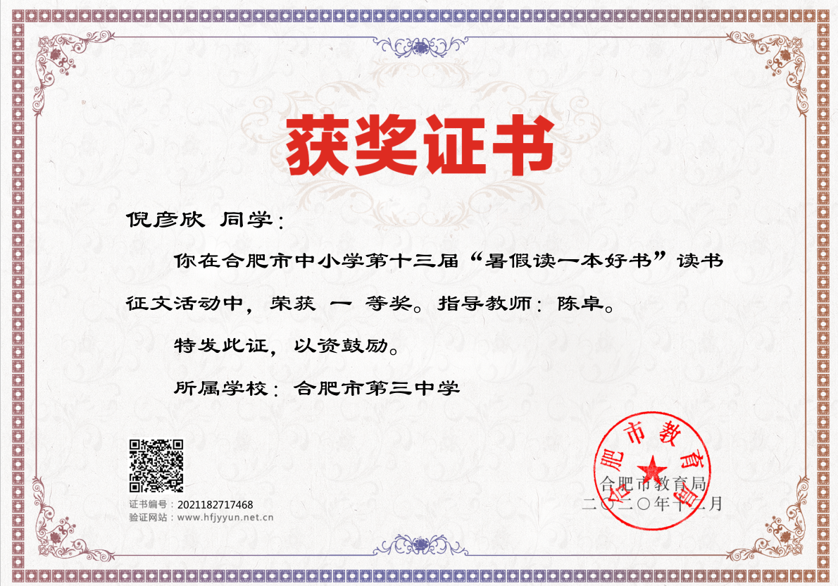 近日,合肥市第十三届中小学生“暑期读一本好书”读书征文评选结果揭晓,点点手机版下载官网app有345名学子获奖,其中一等奖32人,二等奖148人,三等奖165人。在合肥市属学校中名列前列,又一次取得了骄人成绩!特别感谢语文组老师们的大力支持和同学们的积极参与!