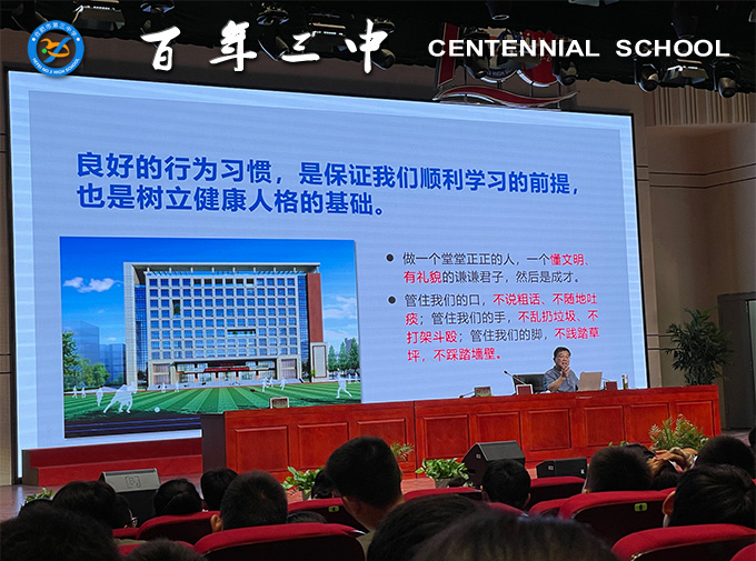 8月30日是入学教育的最后一天,但是新生的学习积极性不减。上午8点,从学校管理的实际出发,副校长冬云为新生们带来了务实的校规校纪讲座。希望同学们,一要心中有理想,肩上有责任,头脑有智慧,脸上有笑容;二要制订一份属于自己的、科学的、有效的学习目标;三要有“惜时如金、只争朝夕”的时间观念,合理安排时间,让自己成为时间的主人; 四要有“无规矩,不成方圆”的纪律观念,迅速转变角色,模范遵守校纪校规。同学们表示,要用自己的实际行动和优异成绩,赓续三中优秀文化,彰显三中学子风采。