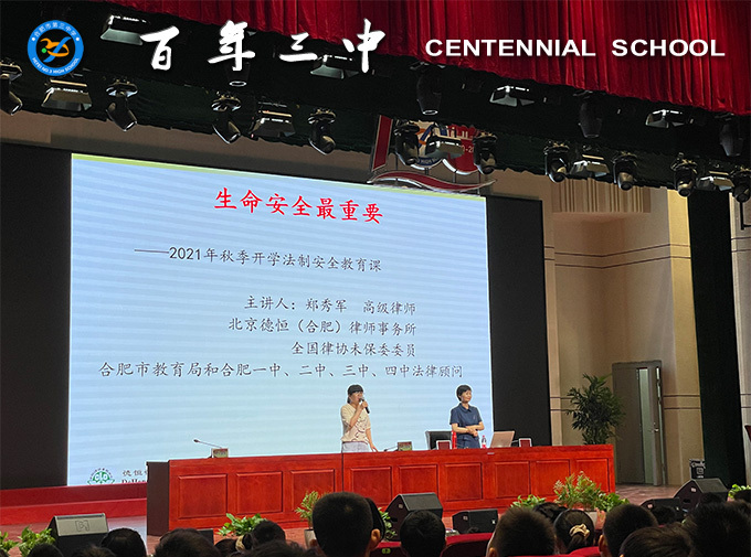 8月30日上午9:30,入学教育的最后一场讲座拉开序幕,全国律协未保委委员、合肥市教育局法律顾问郑秀军高级律师为高一新生们带来了一场法律安全教育讲座。在讲座过程中,郑律师向学生们系统介绍了我国保护未成年人合法权益的法律体系框架,并告诉同学们要珍惜《未成年人保护法》赋予自己的权利,更要自觉履行自己的义务,加强了学生们的法律意识。