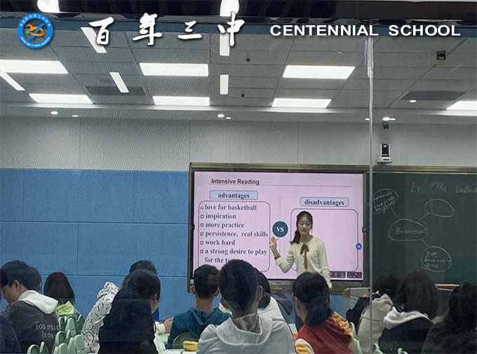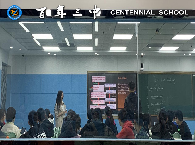 紧接着上课的是张丽娟老师。张老师虽然是一位新老师,但台风沉稳。张老师首先引导学生进行思维发散,请学生尽可能多地说出篮球运动相关词汇,学生积极踊跃地发言,构成整节课良好的开端氛围。后续的快速阅读,细读等环节有序进行,最后通过让学生复述课文的形式,对整篇课文做了一个总结。这节课的最后,张老师用“The Underdog becomes The Big Guy”重新定义了本课标题,对文章主题进行了升华,使学生更加深刻地理解了体育精神的内涵。