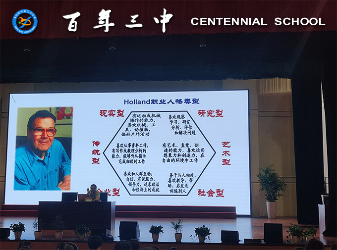 周齐老师用幽默生动的语言和丰富详实的案例为还对自己的未来处于迷茫和动摇心态中的高二学生们上了一节精彩的职业生涯规划指导课。他先用一个愿意居住在哪个岛屿上的小测试调动了全体学生们的积极性,大家踊跃发言交流,做出自己的选择。他根据现代、富庶、原始、文艺等岛屿所反映出的不同心理投射,使用专业的mbit人格测试结果为学生们分析出了其对应的性格特征以及与之相适配的职业倾向,并建议同学们要根据自身的特点和长处来选择将来的职业方向,并亲切建议需要进一步指导和建议的学生可以向他咨询。
